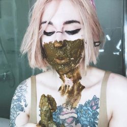 New absolutely crazy video with a huge ass, fresh and fragrant shit, and of course crazy eyes full of desire to get covered in shit and taste it! Her pussy is already wet and her mouth is drooling, fresh shit slowly creeps out of her fat ass, she literally dives into her excrements